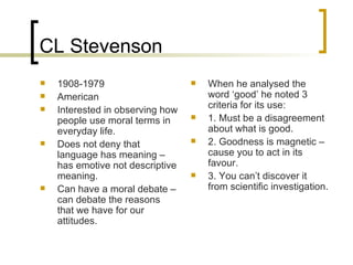 2019Encyclopedia.com | All rights reserved. Hence, it is colloquially known as the For example, St. Augustine maintains that moral knowledge is the gift of God the effect of His illumination (Stump & Kretzmann, 2001). The success of any such explanation depends on the plausibility of the emotivist's claim to have identified the truth-conditional content of the premises and conclusions of moral arguments; it is also arguable that any success must come at the cost of abandoning genuine emotivism and noncognitivism. Feminist Ethics aims to understand, criticize, and correct how gender operates within our moral beliefs and practices (Lindemann 2005, 11) and our methodological approaches to ethical theory. The emotivist proposal therefore is not helpful in understanding the simple moral sentence in these uses, which is reason to doubt whether it has captured its meaning at all. Emotivism teaches that moral statements do nothing more than express the speakers feelings about the issue.